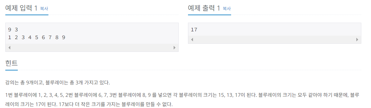 문제는 앞에서 부터 순차적으로 담아야 하므로 특정 블루레이 길이를 가지고 앞에서 부터 꾹꾹 눌러담으며 몇 개의 블루레이 개수로 강의들을 모두 담을 수 있는지 체크하면서 주어진 개수를 만족하는 블루레이의 최소길이의 값을 찾아나간다.